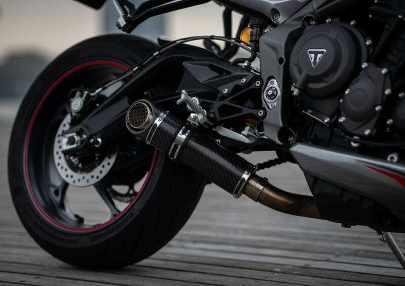 So you do get nice things for your money! Very nice stuff to be honest. You will continue to discover details when you park the Street Triple RS in front of you ! The carbon exhaust end cap, the well-known gold of the Öhlins installation, are great details! The paintwork of the bike is also of good quality.